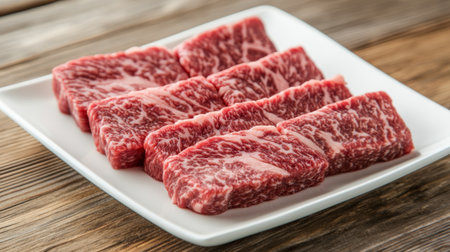 A close-up of marbled beef steak slices on a clean white plate, with a focus on the rich texture and fat marbling, set against a rustic wooden table