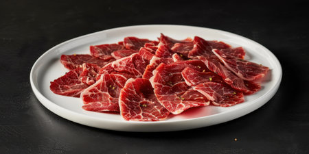Angus Fatty Beef Slices Raw Meat White Plate Black Background Commercial Photography