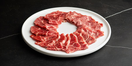 Fresh beef slices with intricate marbling of fat, showcasing tenderness and juiciness, perfect for gourmet dishes or hotpot.