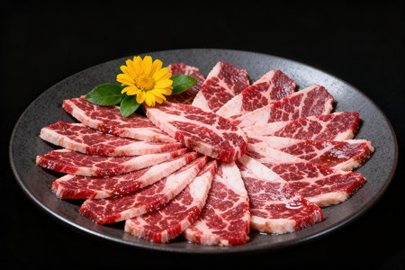 Raw beef sliced with marbled meat on black plate and yellow flower