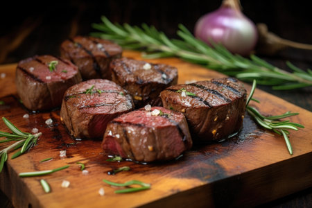 grilled venison steaks with rosemary and garlic cloves, created with generative ai