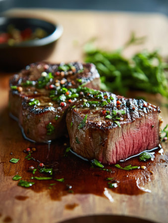 A beautifully cooked beef tenderloin garnished with fresh herbs and spices, displayed on a rustic wooden cutting board, perfect for gourmet dining.