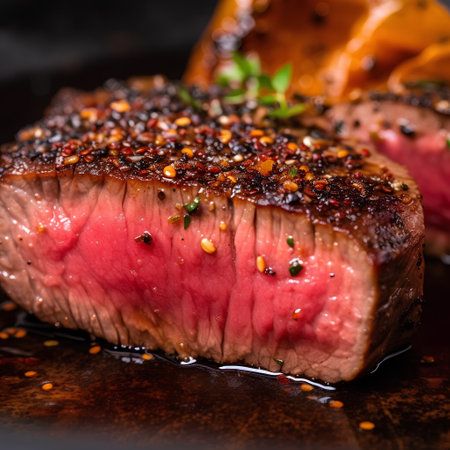 Close up steak photo with crispy crust juicy center herb butter and charred sides for culinary use