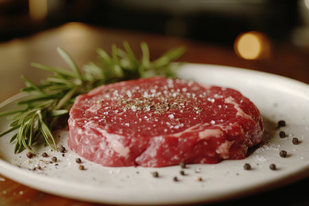 A beautifully marbled raw steak lies on a white plate with fresh rosemary and black pepper ready for grilling in a cozy kitchen. Natural light enhances the fresh ingredients and atmosphere.
