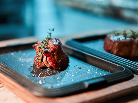 Succulent grilled steak served on a dark plate, garnished with fresh herbs. This dish highlights perfect cooking techniques for a flavorful meal.