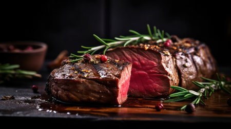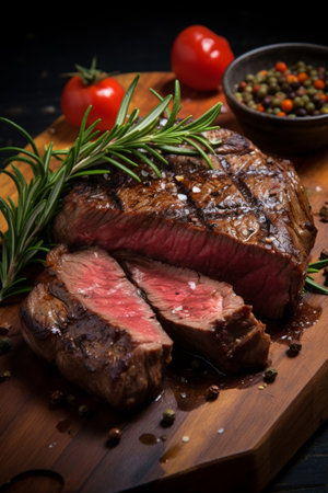 AI Generated. Juicy Grilled Steak on Wooden Cutting Board with Rosemary