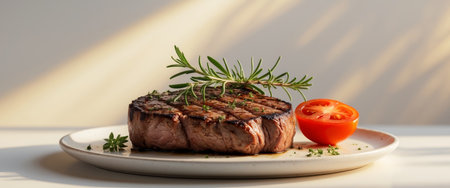 AI Generated. Juicy grilled steak garnished with fresh herbs and vibrant cherry tomatoes on a plate