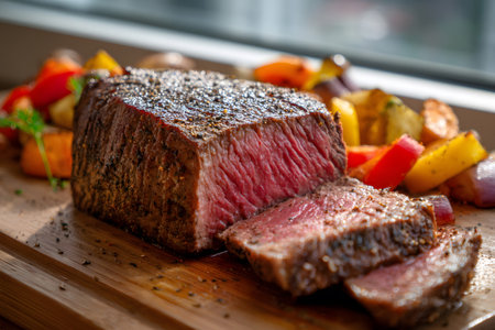 Slices of perfectly cooked steak are arranged on a wooden board alongside vibrant roasted vegetables. This delicious meal highlights flavors and quality ingredients.