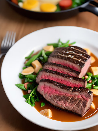 AI Generated. Deliciously prepared steak on a white plate with grilled vegetables and greens ready to eat