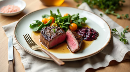 Juicy grilled fillet steak on a plate with fresh salad generated by artificial intelligence