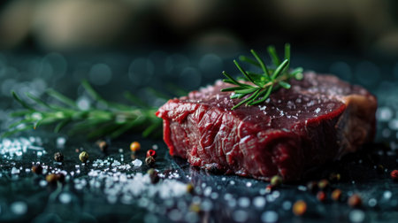 Gourmet medium rare steak resting on a rustic surface accompanied by rosemary sprigs and scattered spices