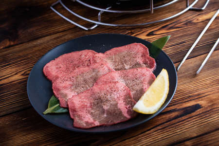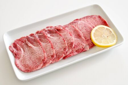 raw five pork or beef tongues with green onion, on white plate gourment food conception, selective focus