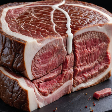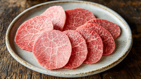 Delve into the rich textures of thinly sliced marbled beef, beautifully arranged on a rustic plate. Ideal for culinary presentations and gourmet recipes.