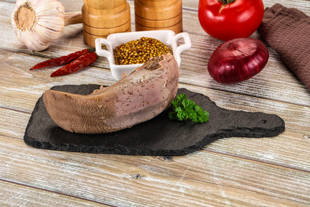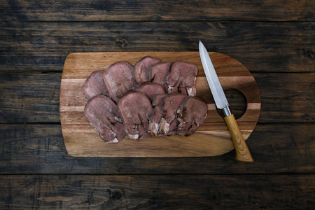 Sliced boiled Beef Tongue Slices on Wooden Board with mustard
