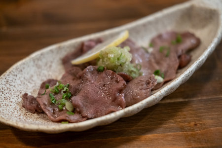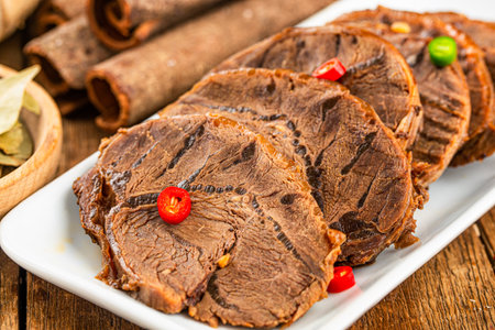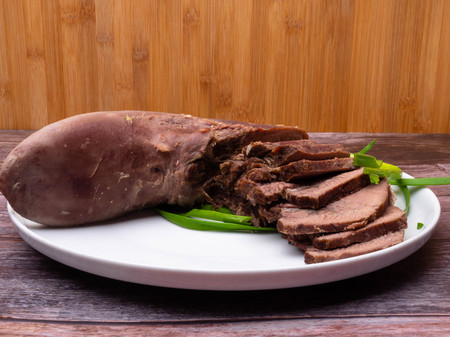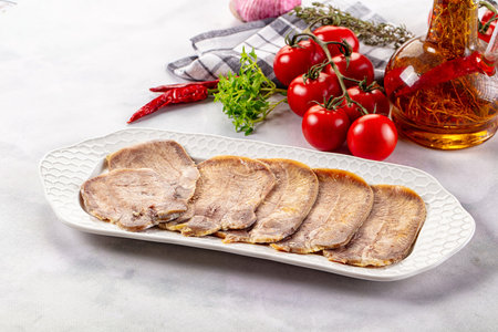 Beef tongue sliced in thin slices on a plate on a brown rustic background. restaurant menu