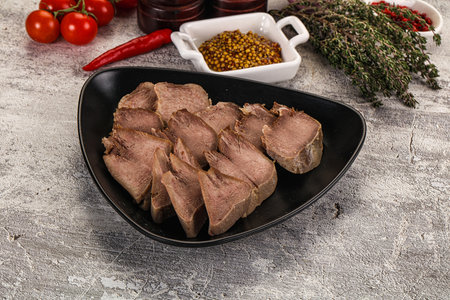 Delicious boiled beef tongue sliced with vegetables and spices on a dark concrete background