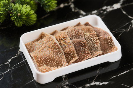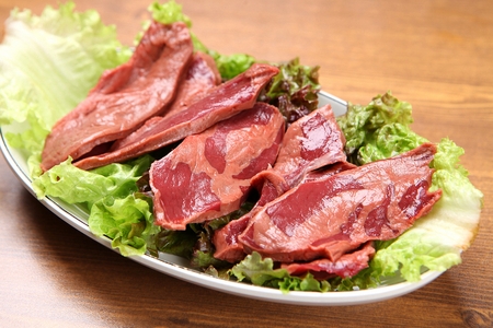 Close up of sliced raw beef tongue, ready to be cooked by hot pot
