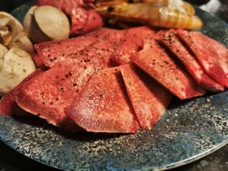 Platter of Japanese Yakiniku meat set consists of Wagyu mabled meat, mushrooms, tiger prawns beef tongues