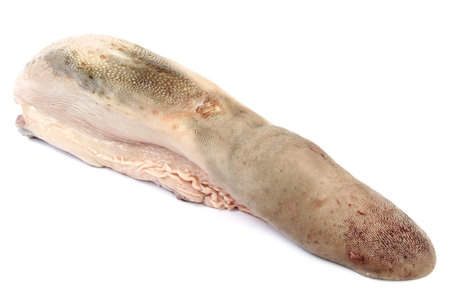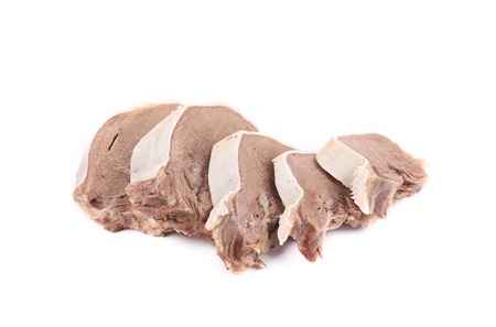 Uncooked Raw beef or veal tongue on butcher board with meat cleaver. Isolated on white background