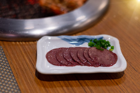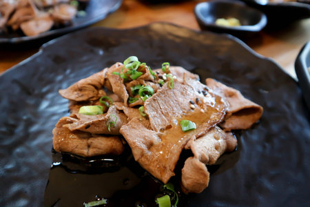 pork or beef tongue slices with chinese cabbage, green onion on white plate