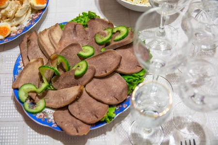 Boiled and sliced tongue with greens and mayonnaise, a delicious banquet option
