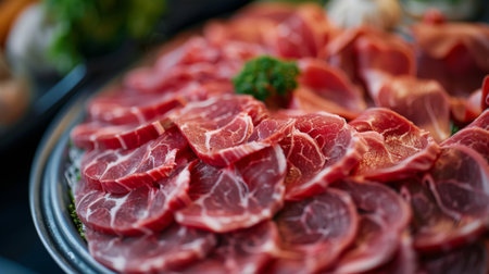 Close-up of thinly sliced premium beef arranged neatly on a platter, awaiting to be cooked in a flavorful broth