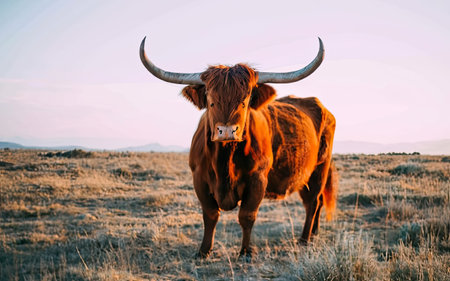 Close-up of a bull in the prairie at sunset.