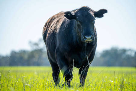 Stud Angus, wagyu, Murray grey, Dairy and beef Cows and Bulls grazing on grass and pasture in a field. The animals are organic and free range, being grown on an agricultural farm in Australia.