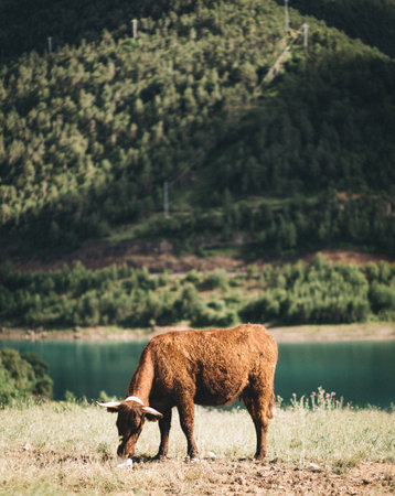 A vertical shot of a brown cattle grazing on the grass-covered field by a lake