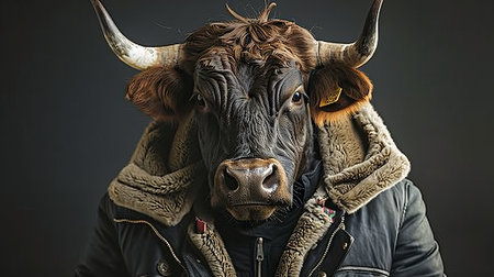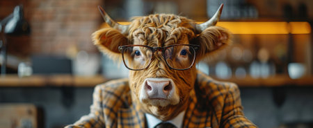 A stylish bull wearing a suit and sunglasses, exuding confidence and sophistication, set against an urban background.