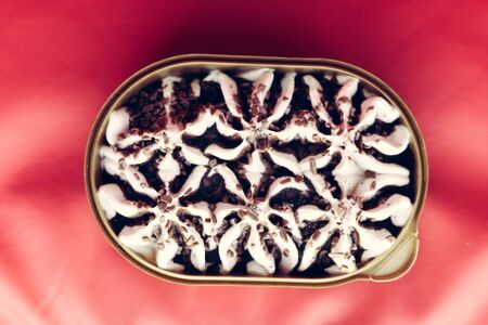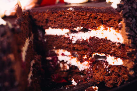 Homemade truffle-cranberry cake chocolate cream cut into pieces on table