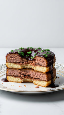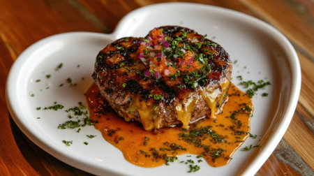 A delightful grilled burger patty topped with melted cheese and fresh herbs, elegantly served on a heart-shaped plate for a charming dining experience.