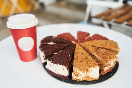 Paper cup of coffee with dessert. Coffee with cake on white table