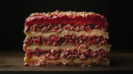 A cross-section view of a lasagna showing the perfect layering of pasta, rich sauce, and gooey cheese, ready to be served.