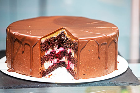beautiful chocolate cake with sponge dough with a cut piece on display