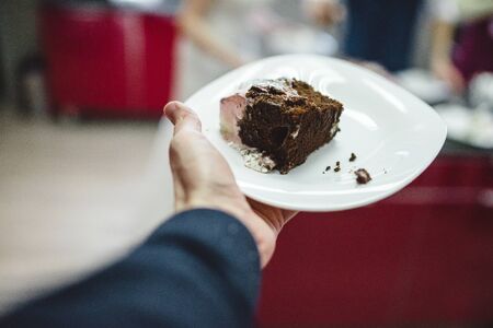 mens hand holding Slice of glazed chocolate wedding cake on the plate