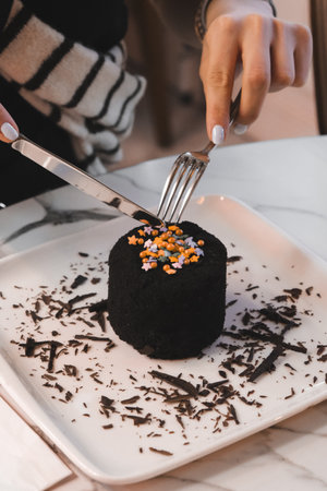Generative AI : Halloween cake on a white plate with holiday table decoration Grey background Copy space Top view