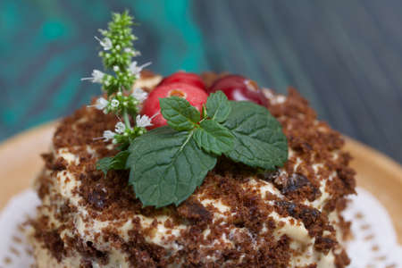 Piece of multilayer honey cake with cream. Classic honey cake pieces with custard. Homemade honey cake on wooden background with cherry and mint leaves. Delicious slice of layered tart on plate