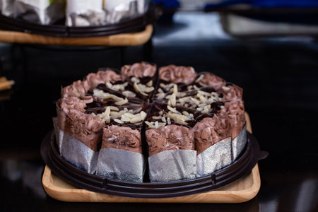 Triangle slice piece of delicious dark chocolate fudge cake on background bokeh. Concept to present homemade bakery dessert
