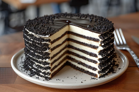 Delicious layered chocolate cake with creamy filling displayed on wooden board in cozy café setting
