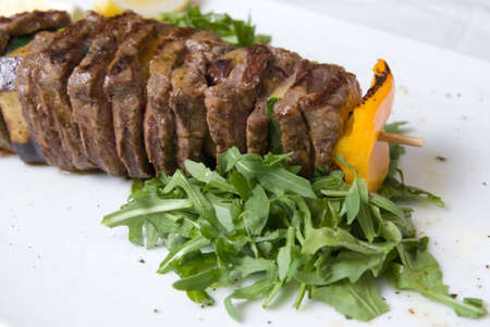 shashlik with potherbs on the plate