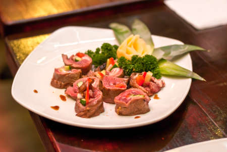 Juicy Skirt steak in addition with a vegetable garnish. Dish from the chef