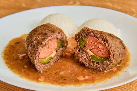 Tasty czech food spanelsky ptacek stuffed beef with sausage, pickles and egg with gravy and rice on white plate