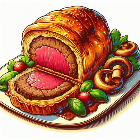 Beef Wellington is a steak dish of English origin, made from sirloin breaded with pate and duxelles, wrapped in puff pastry and then baked.