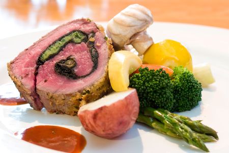 Fillet of Veal topped with Foie Gras. Garnished with vegetable