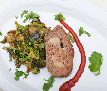 macro meatloaf with tomato sauce and zucchini on a white plate on a black studio