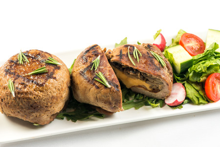 Veal meat rolls stuffed with mushrooms and herbs. Dish of beef