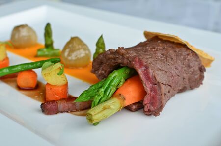Portion of beef and asparagus rolls appetizer