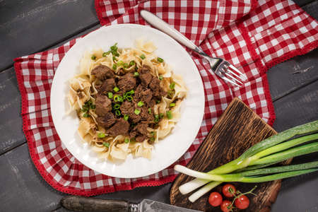 Stewed beef with tagliatelle pasta on plate. Top view.
