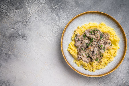 Plate of tender beef stroganoff served with creamy mashed potatoes and steaming gravy. gray background. top view.